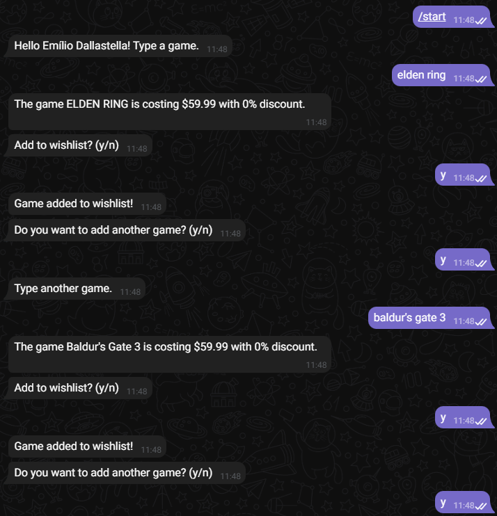 For now, the project is already streaming Steam and Epic Store data and working with Telegram bot messaging the user when a wishlist game enters in promotion: