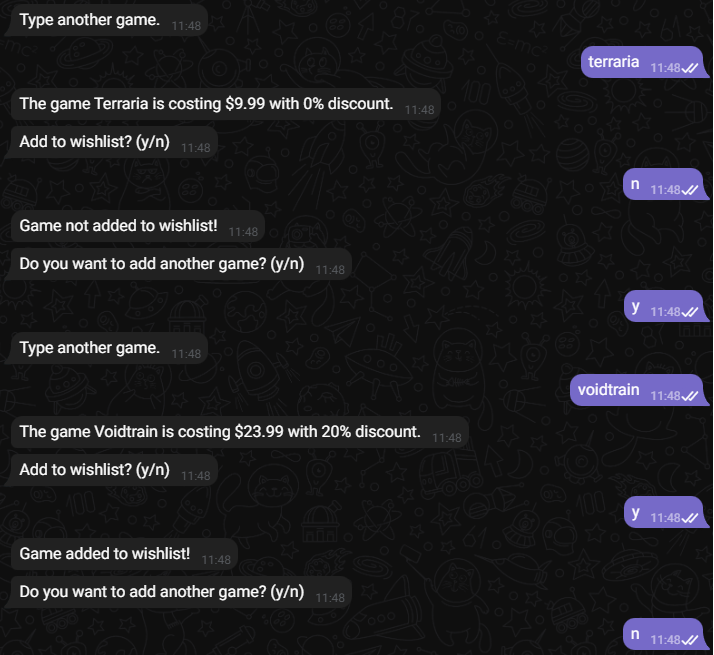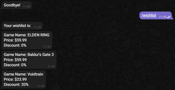 The user is prompted if he wants to add the game to his wishlist. Each wishlist is unique to each person and they are linked by the user's telegram chat code.